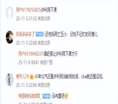 许利民在联赛犯的错误依然没有得到改正,在联赛也是先赢后输,胡乱换人,遭逆转屡屡出现,赛后言论更是奇葩,输了却说是赢了,还有计划内输球等谬论,为自己的无能找各种借口。球迷也是怒了,他们批评“又是熟悉的味道,哪个状态好就是换下去”、“明知道天津没内线,就时德帅一个,给他强度啊!”球迷认为北京队最大的短板应该是教练,并呼吁“得赶紧让许利民下课才行”、“今年北汽还是许利民当教练的话,cba就还是没戏”。诸位,你对许利民的糟糕指挥,有何评论?