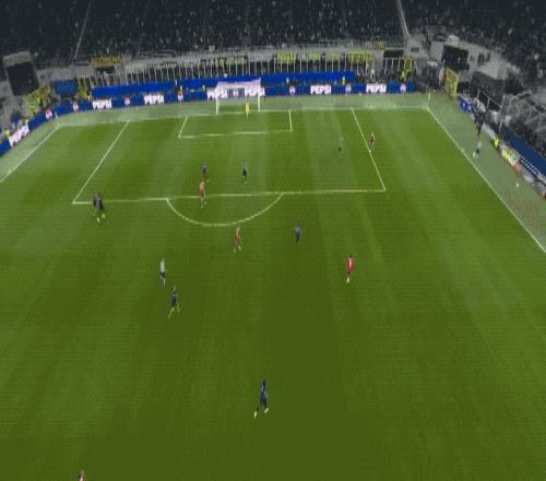 直到第38分钟,国米才完成了本场的第一次射门,巴雷拉的任意球绕过人墙,稍稍偏出。