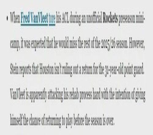 名记Stein:火箭目前没有完全排除范弗利特本赛季复出的可能性。